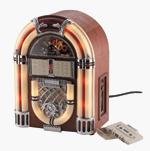 Item #ELJUKE2 Do you remember 1946? Well, you will with this 1946 "juke box design" reproduction. This Mitaki-Japan® AM/FM/cassette Classic Lighted Radio/Cassette Player is a faithful reproduction of the old juke box including lighting up, a list of some oldie but goodie song titles that folds open to reveal the hidden function selectors, and imitation records inside the cabinet. A modern cassette player is located on the side of the juke box. This electric cassette/radio stands 14-1/2" x 10-1/2" x 6-1/2" and is housed in an antique, handcrafted, solid wood cabinet. UL approved. Retail price $189.95. My price $84.99 |